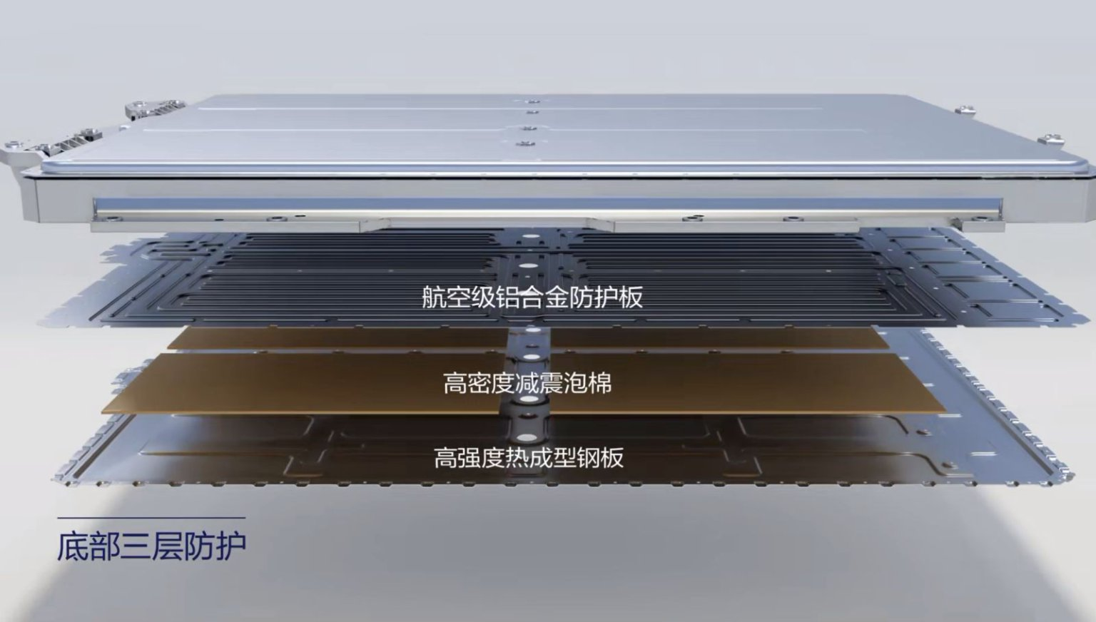 而华为巨鲸电池平台的电池包本体,也采用了五层底部防护设计,这五层防护设计通过热成型钢、航空级铝合金护板与高密度减震材料打配合,不仅让电池底部拥有防止石块、金属穿刺的能力,同时还耐高温、耐腐蚀、耐磨损,相当于为电池提供了一层坚固的“铠甲”作为外盾。