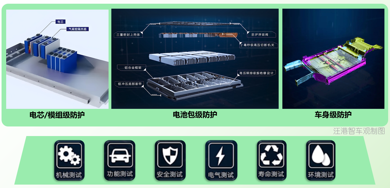 而解决办法的本质只有一个,那就是:把电芯层层包裹于密不透风铜墙铁壁的城堡之中。从整车设计的角度来看,可以拆分为电芯/模组级防护、电池包级防护、车身级防护三大类。