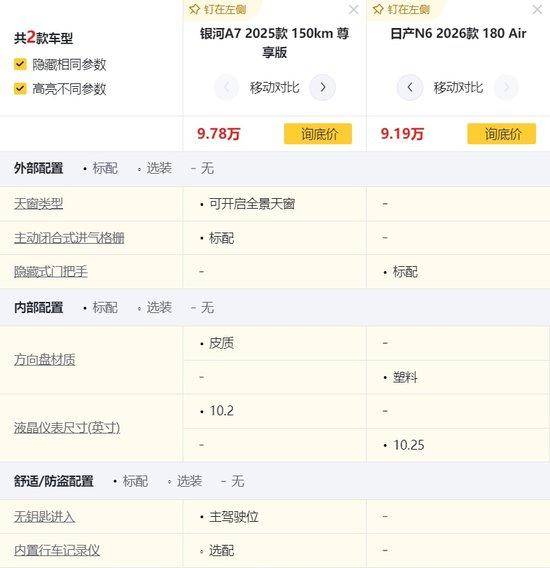 尽管日产N6的限时售价略低,但结合配置表现来看,其"入门即简配"的设定让消费者难以接受,性价比劣势进一步凸显。