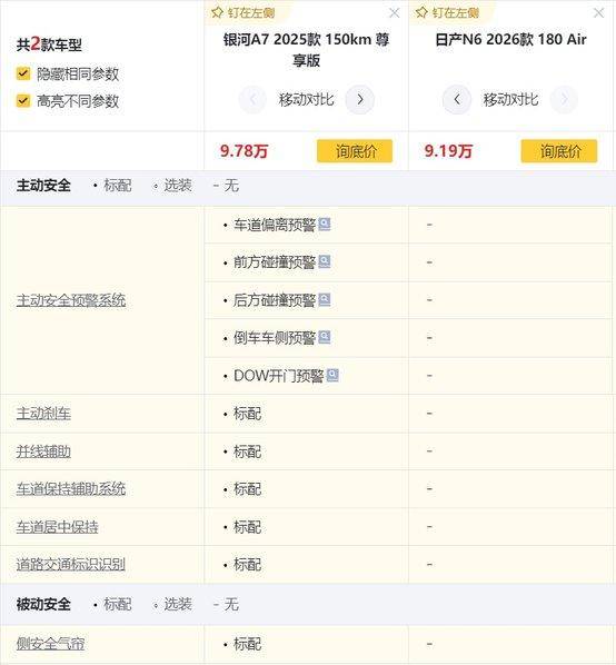 银河A7进一步搭载前后驻车雷达、透明影像、360度全景影像、车侧盲区影像、自适应续航、全速自适应续航及L2级辅助驾驶系统,极大减轻了驾驶负担;反观日产N6,上述配置依然,智能化水平与市场主流脱节。