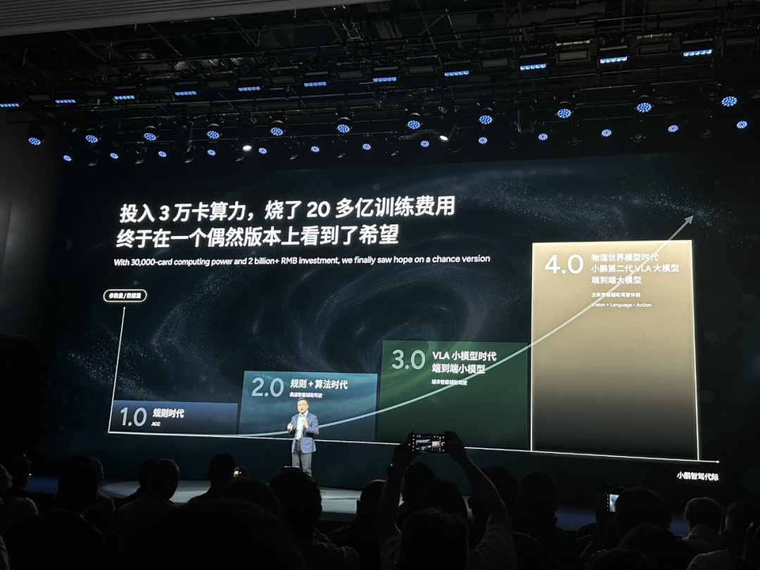 何小鹏在今年的科技日上则表示,第二代VLA是小鹏投入了3万卡算力,烧了20多亿训练费用,才终于在一个偶然版本上看到了希望——有钱还不行,有时候还得看运气。