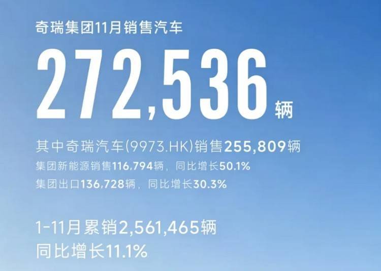 奇瑞汽车11月共卖出新车272536辆,新能源汽车销量为116794辆,海外出口业务依旧表现强势,11月出口新车136728辆,同比增长30.3%,连续七个月单月出口突破10万辆。分品牌来看,奇瑞品牌11月份销售165511辆;星途品牌11月份销售12021辆;捷途品牌11月份销售55088辆;iCAR品牌11月份销售11428辆,智界品牌11月份销售11761辆。