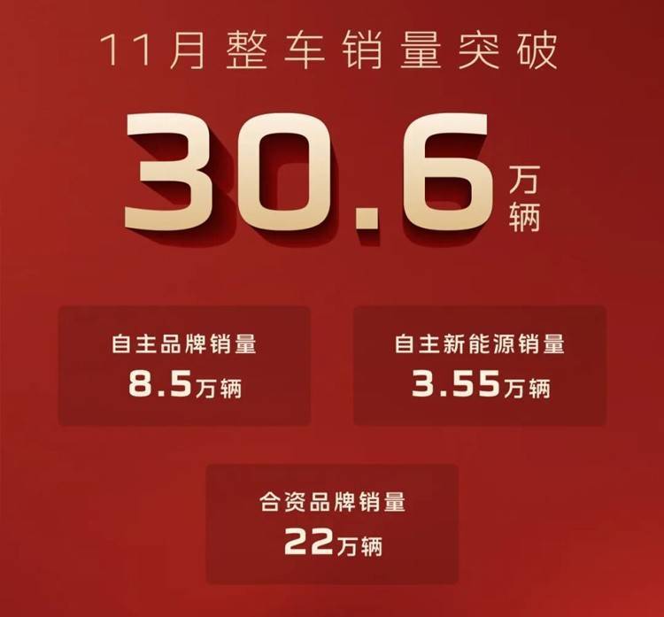 中国一汽公布了其11月份30.6万辆的销量成绩,合资品牌卖了22万台,是绝对的销量主力;自主品牌销量为8.5万台,自主品牌新能源销量为3.55万辆。红旗品牌11月份单月销量40506辆,红旗新能源产品销量同比增长60.8%;一汽奔腾11月销量19520辆,其中包括15793辆的新能源车型。
