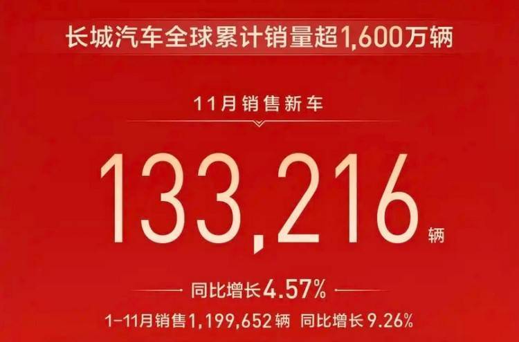 根据长城发布的官方数据,其11月份共销售新车133216辆,其中新能源车型销售40113辆,同比增长11.43%,海外销售57309辆,同比增长32.70%。哈弗品牌11月份销量75383辆;魏牌新能源11月销售12763辆;坦克品牌销售24135辆;长城炮(参数|询价)销售16011辆;欧拉品牌销售4821辆。