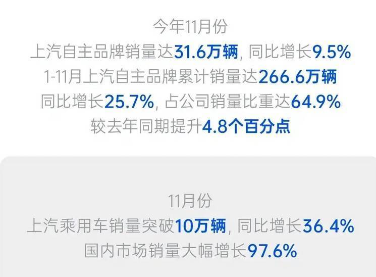 今年11月份,上汽自主品牌共销售新车31.6万辆,上汽乘用车(荣威+名爵)销量突破11万台,其中新能源车销量4.2万辆;上汽通用五菱销量达到16.6万辆,新能源车销量12万辆;上汽大通卖了2.4万台,包括超8000台的新能源车型;智己汽车11月销量1.3万辆,连续三个月销量破万。