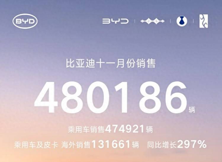 比亚迪11月份销售新车480186辆,其中乘用车销售474921辆,乘用车及皮卡海外销售131661辆。具体品牌来看,王朝/海洋网合力贡献423558辆,是绝对的销量主力;腾势销售13255辆;仰望销售703辆。看点最足的就是方程豹品牌,由于钛7(参数|询价)的热销,方程豹11月销量达到37405辆,同比暴涨339%,这其中钛7就贡献了24019辆。