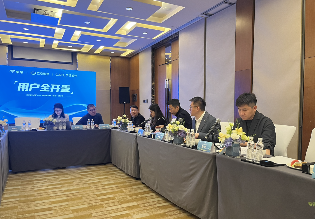坐在高先生以及其他6位车主对面的,是广汽埃安BU副总裁、埃安品牌首席用户官杨龙,京东汽车营销副总裁陆欢,宁德时代电服副总裁邓旭。