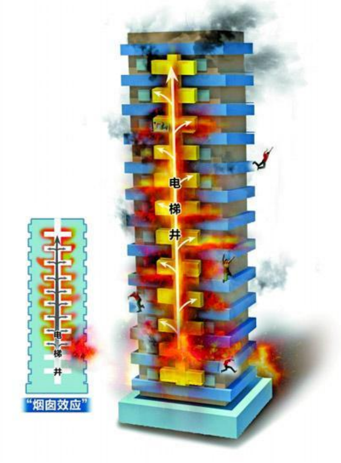 由于建筑内部的温度会高于外部温度,尤其是在冬季里;而热空气的密度又低于冷空气,于是在楼梯间、电梯井和建筑的几乎所有空间里,空气都是向上流动的,就像是点燃一个炉灶,烟火气总会顺着烟囱向上流出一样。这就是所谓的“烟囱效应”且同时叫做热压通风,那么一旦某一个中低区域的楼层起火,火势则难免迅速向以上楼层蔓延。