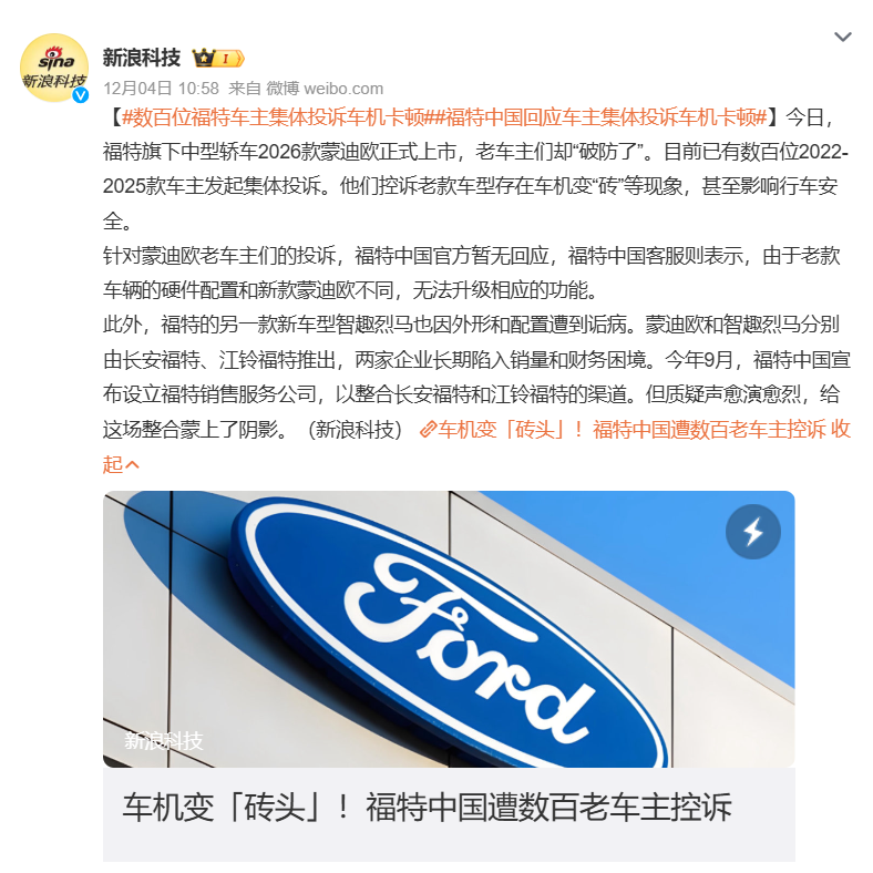截至2025年12月初,部分第三方平台信息显示,超过360名2022-2025款蒙迪欧车主在投诉平台发起集体投诉,核心诉求直指老款车机系统严重卡顿问题。