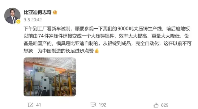 车身制造,应用9000吨甚至13000吨巨一体化大压铸技术,提升车身刚性的同时,减重超100公斤。