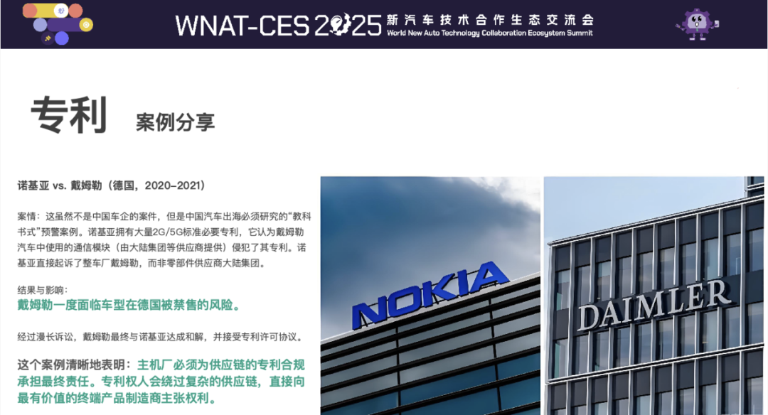 因为对专利权人来说,他们首要考虑的是“切入后能获得最大价值的环节”,而主机厂就是这个核心环节。所以我们在专利上投入了很大资源,就是为了规避这种风险。这个案例也清晰说明:主机厂必须为供应链的专利合规承担最终责任,专利权人会绕过复杂的供应链,直接向最有价值的终端产品制造商主张权利——这就是诺基亚为什么起诉戴姆勒的原因。