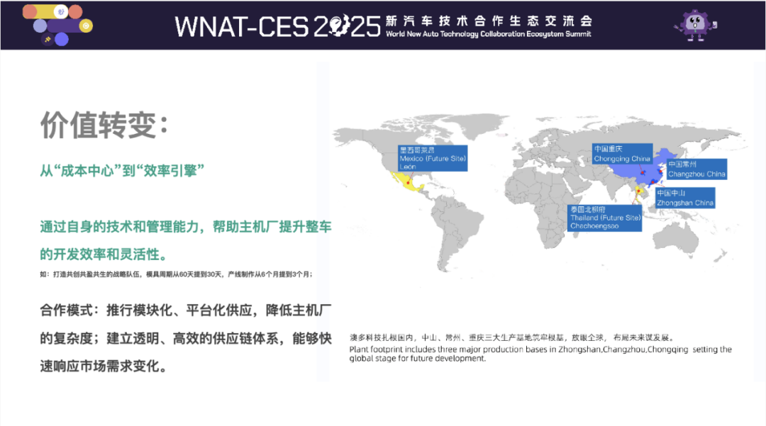 第三个方向,是从“成本中心”转向“效率引擎”。这个比较好理解,就是推行模块化、平台化供应,降低主机厂的供应链复杂程度;同时建立透明、高效的供应链系统,快速响应市场需求变化——现在车型开发速度太快了,有些项目从立项到量产只要半年、一年,和以前的三年、两年相比,差别非常大。
