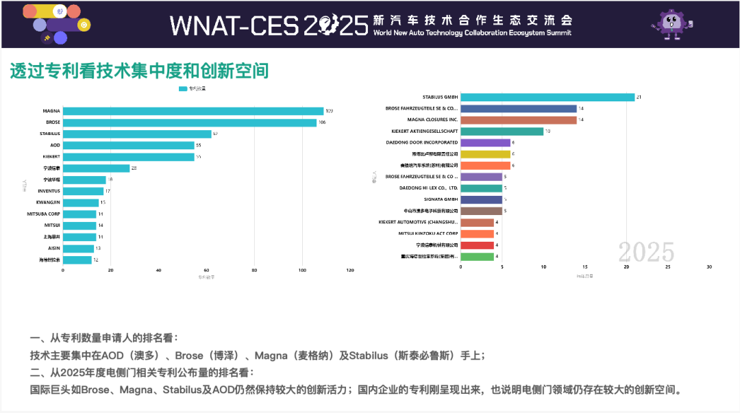 我们再从专利角度看看电动侧门的现状。我做了调研,从地域上看,电动侧门的主要市场现在是中国、德国、北美、日韩,这些国家的用户有能力消费这个产品。从专利申请和公布的趋势来看,这几年电动侧门的专利申请几乎是爆发式增长,这说明产品开始走向成熟,得到了市场认可——这都是通过专利分析得出的结论。