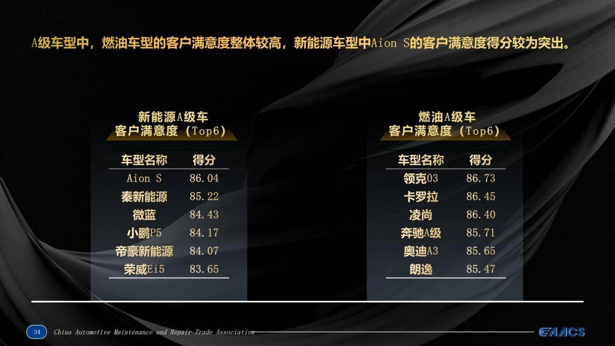 近日,中国汽车维修行业协会发布《2025年汽车售后服务客户满意度调查(CAACS卡思调查)》,本次调查共涉及38个乘用车品牌、185款车型。在新能源品牌客户满意度排行榜中,广汽埃安以86.39分高居所有品牌第一名;车型方面,Aion S和Aion Y分别拿下新能源A级车第一、新能源SUV第一。