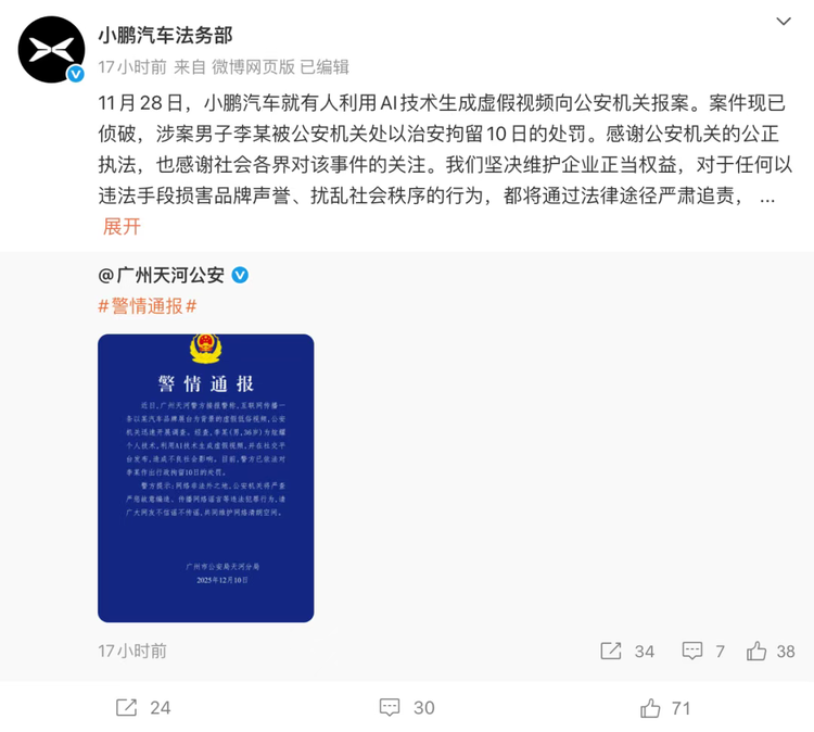 最近广州车展“AI生成不雅视频”事件引发热议,男子李某为炫技用AI伪造虚假视频传播,被警方依法拘10日,小鹏汽车火速报警并核实车展从未邀请模特,坚决维权获赞。这事儿敲响警钟:AI技术不是“法外之地”,滥用造谣终将自食其果,咱网友也得擦亮眼睛,不信谣不传谣,共同守护清朗网络。#AI造谣被拘 #清朗网络空间