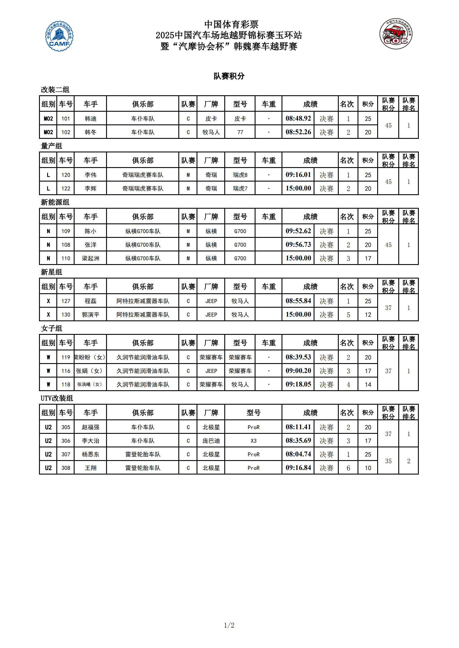 新能源组则由纵横G700车队包揽前三,109号陈小以09分52秒62强势领跑,摘得冠军;108号张洋紧随其后,以09分56秒73获得亚军;110号梁起洲则获得第三名,纵横车队完成新能源组三席全占的强势表现。