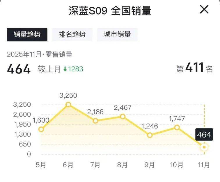 11 月销量:464 辆,跌至三位数的惨淡成绩,标志着这款高端战略车型已陷入 “销量与口碑双崩盘”。