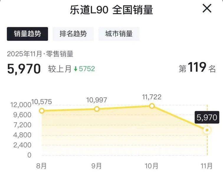 不过从品牌交付数据来看,乐道品牌 11 月共交付新车 11794 台,乐道 L90 上市 4 个月累计交付量仍有 39319 台。