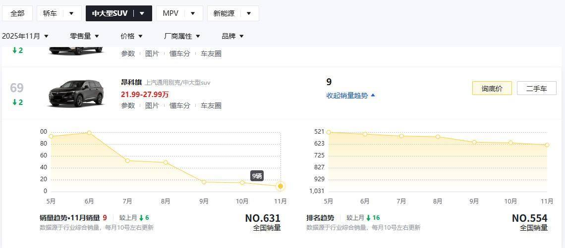 兄弟们,说出来你们可能都不信,别克昂科旗(参数|询价)在11月份的销量数据居然只有9辆新车。而且即便是再往前推半年,昂科旗每月的销量数据也不过才区区十几到几十台,这是让我们所没有想到的。要知道,以前这车可是能月销上千台的,可现在却变成了一个月销个位数、且连续多月销量下滑的销量表现,那这又是为何呢?为啥别克昂科旗这车没人想买了呢?我们来简单分析分析。