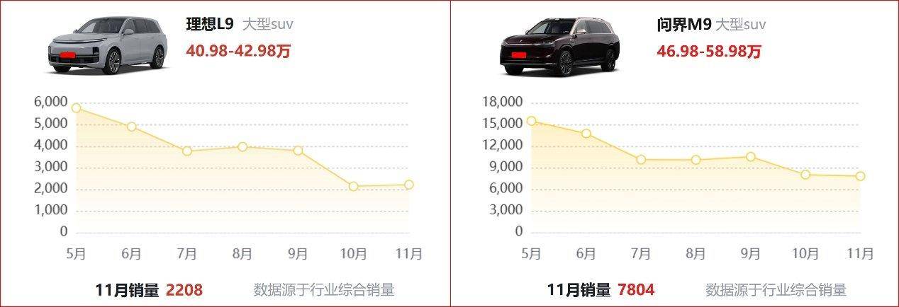 不知道您有没有发现,国内车市不少“当时现象级的9系车型”,或随着自家推出低端产品之后,或受市场竞争、消费者喜好转变和审美疲劳影响,销量正呈逐渐下滑趋势,比如理想L9,比如问界M9,我们先来看看这两款车型近半年左右的销量曲线。