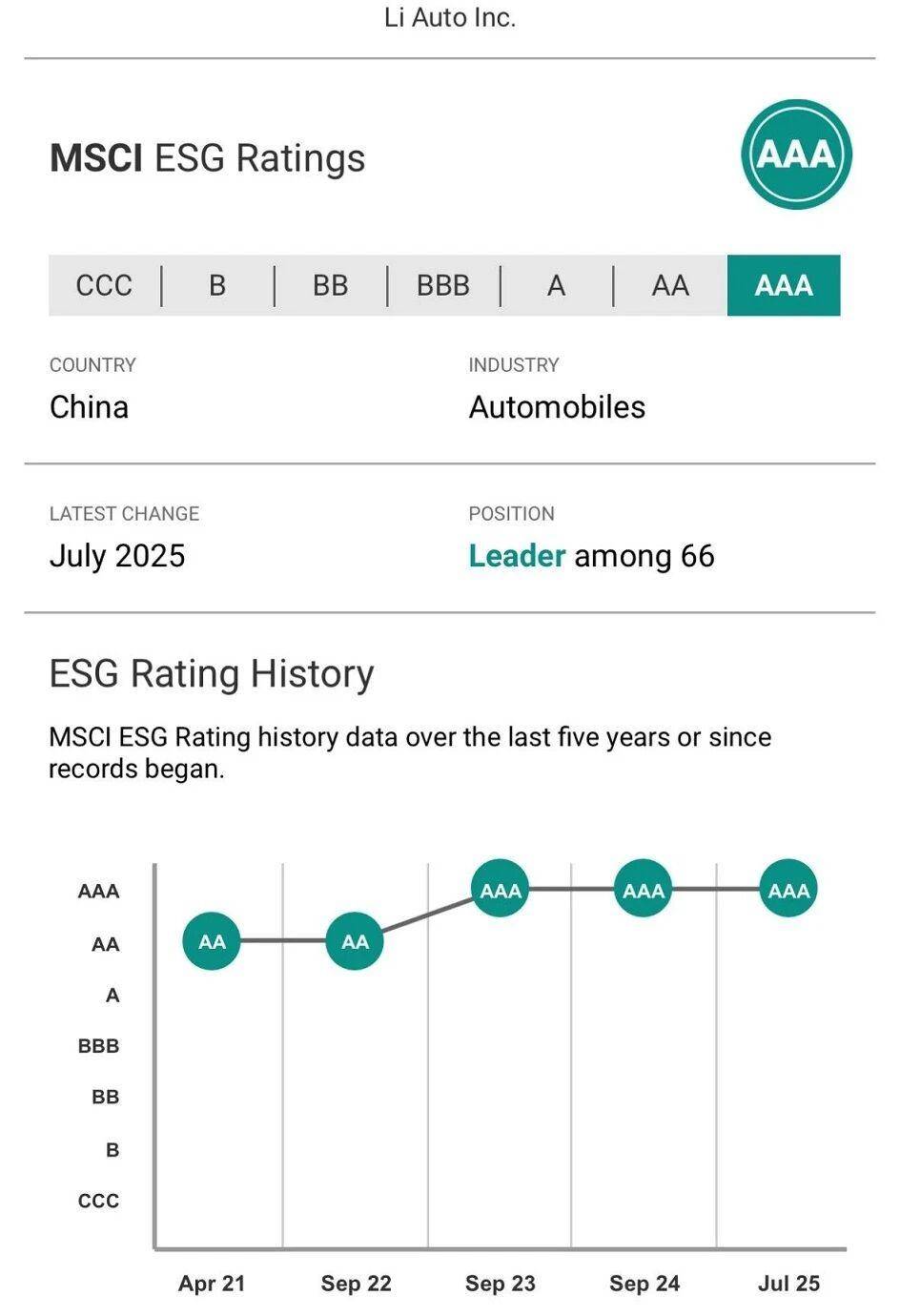 2023年,理想汽车获得MSCI ESG全球最高“AAA”评级,成为国内首家获此殊荣的新势力车企;2025年,理想再次蝉联该评级,用实际行动证明了其在环境、社会、治理方面的持续投入。
