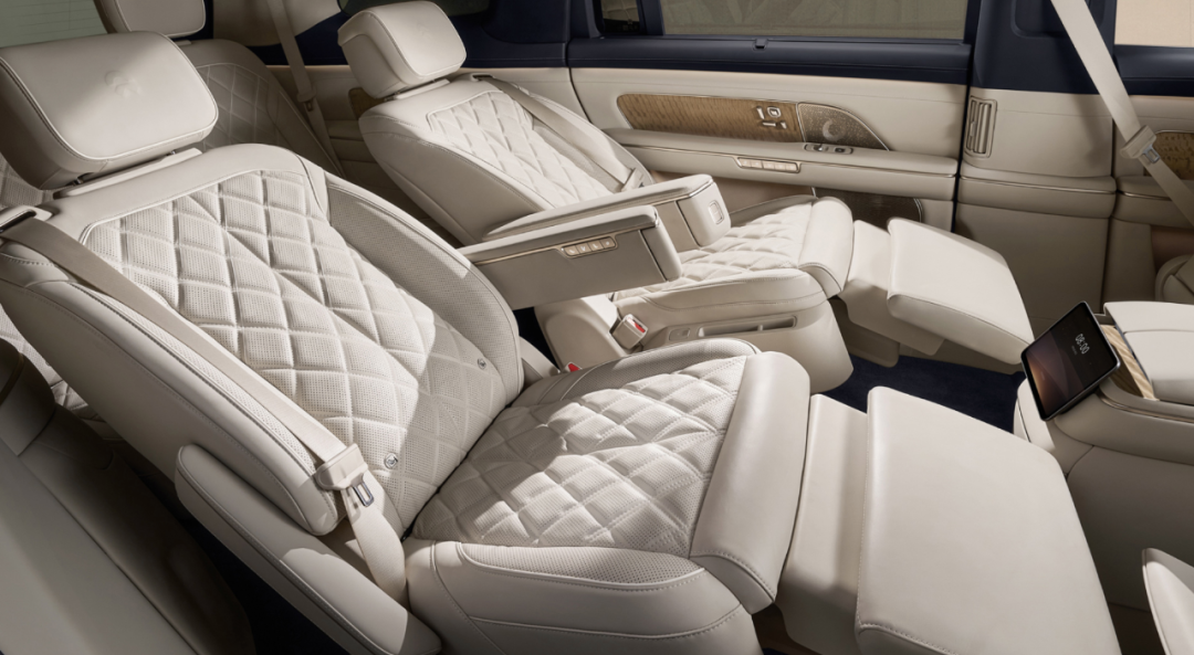 三把零重力座椅,第三排 130° 大躺角,二排 26 向调节,150mm 横滑。