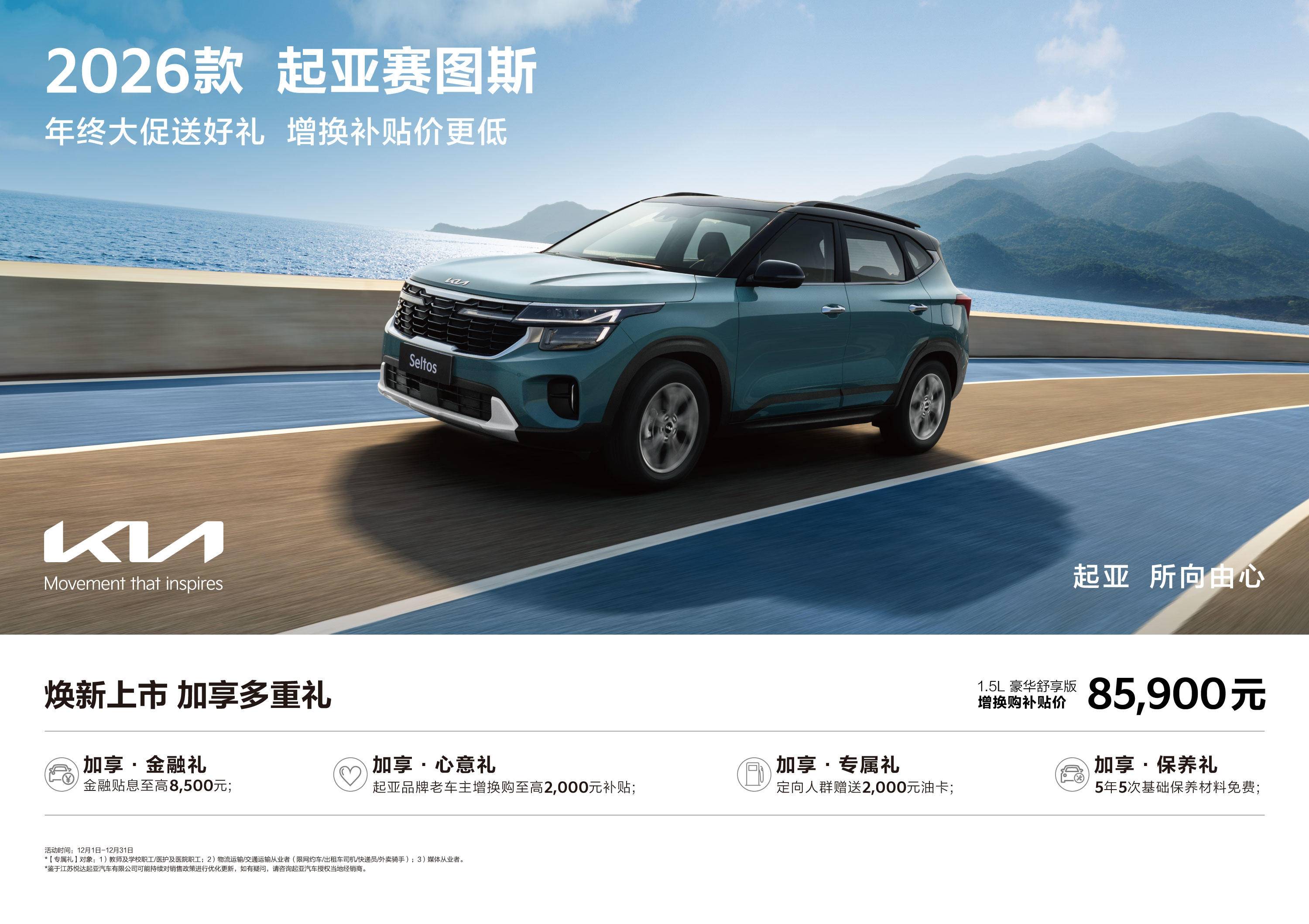 12月31日前,消费者购买2026款起亚赛图斯还可享多重购车福利,以官方指导价129,900元的1.5L豪华舒享版为例,增换购补贴价仅需85,900元,消费者购车另享至高8,500元金融贴息、定向人群赠送2,000元油卡、起亚品牌老车主增换购至高2,000元补贴,以及5年5次基础保养材料免费等权益。