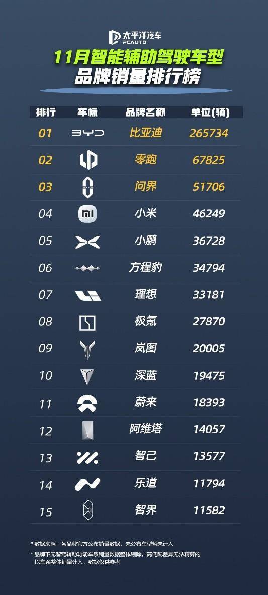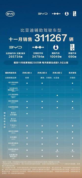 近日,比亚迪公布了其搭载天神之眼辅助驾驶系统的车型在11月的销售数据,全月销量达311267辆,继续引领市场。其中,比亚迪王朝与海洋系列贡献265734辆,方程豹、腾势、仰望等高端及个性化品牌亦表现稳健,共同构筑了比亚迪在智能驾驶领域的强大产品矩阵。