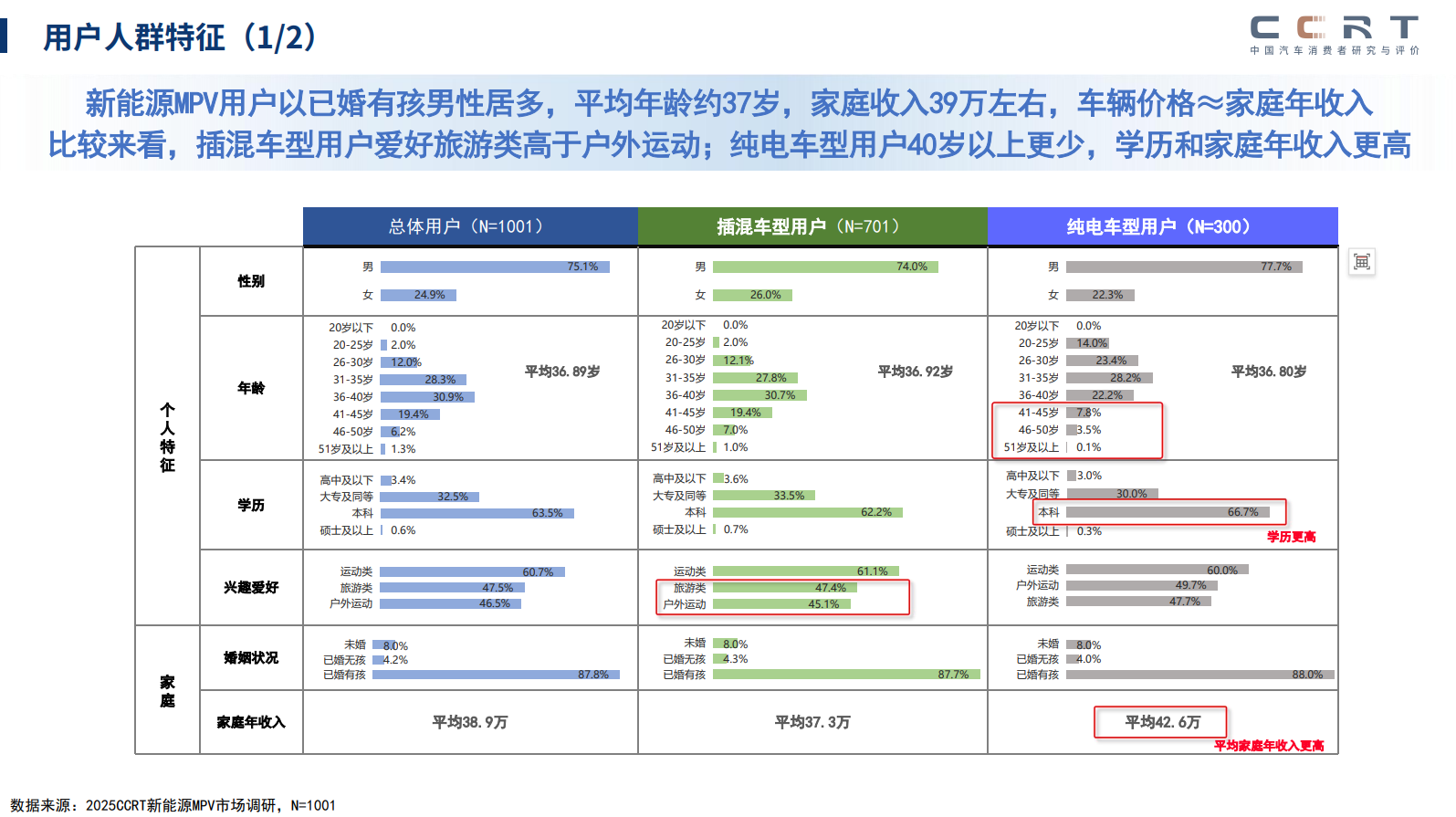 CCRT通过千份样本调研,勾勒出典型高端新能源MPV用户的清晰画像:平均年龄37岁,已婚有孩,家庭年收入约39万元。这一群体呈现出鲜明的“务实精英”特征,其购车行为与消费观念较以往发生了显著变化。