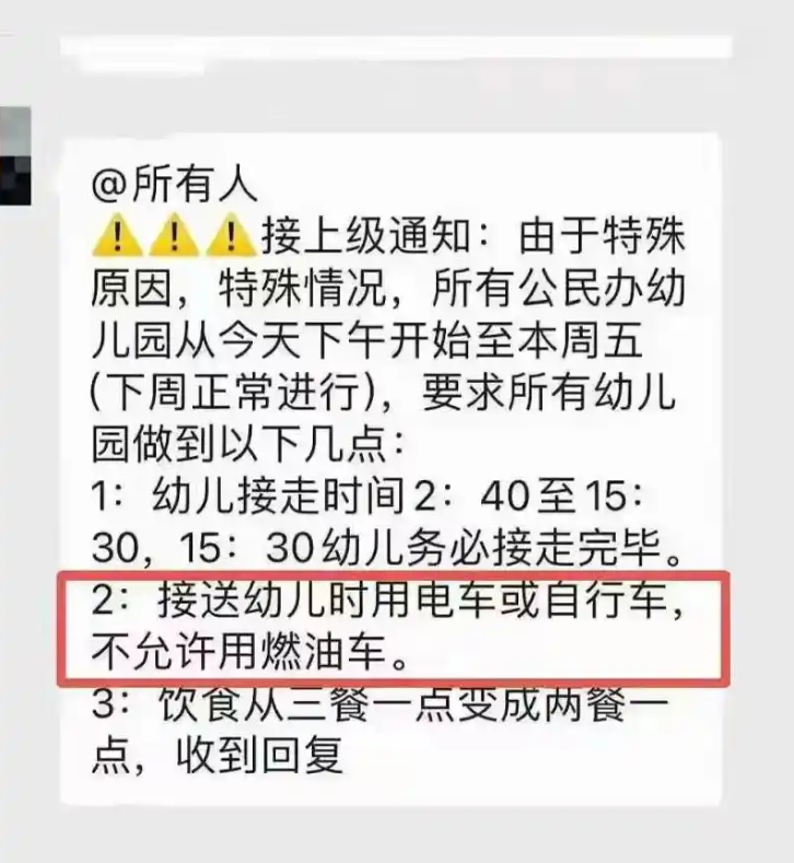 河南开封兰考部分幼儿园家长群中出现一则奇怪的通知引发关注。通知内容涉及“禁止开燃油车接送学生”的描述,甚至还有“发现后记录车牌号批评教育”的内容;诸多网友表示无法接受,认为学校“管得太宽”了。