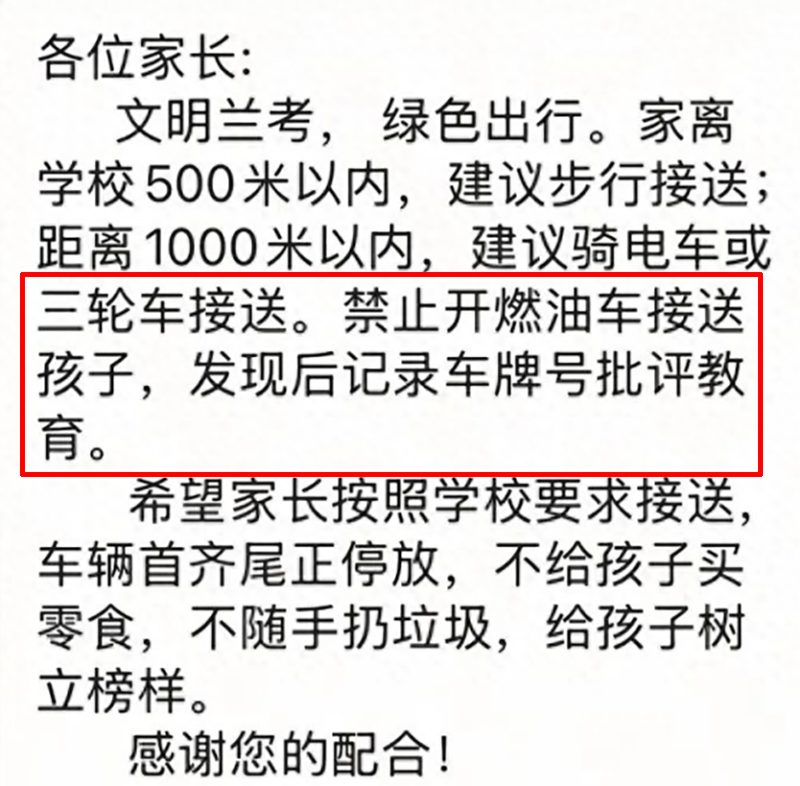 学校只是教育机构,相关通知也只是倡议绿色出行,并没有所谓的禁止用燃油车接送学生;那么负责转达通知的相关工作人员的职业素养则难免令人质疑,学校有什么权利禁止学生家长使用什么特定类型的交通工具?其显然没有这样的权限,更没有执法权,其完全不具有对学生家长“批评教育”的资格;学校的职责是教育教学,只有对学生管理的教育关系,然而现在有些学校或教职人员确实是管得太宽,认为拿捏住了学生就等于拿捏住了家长,这种心态从根本上就是错误的。