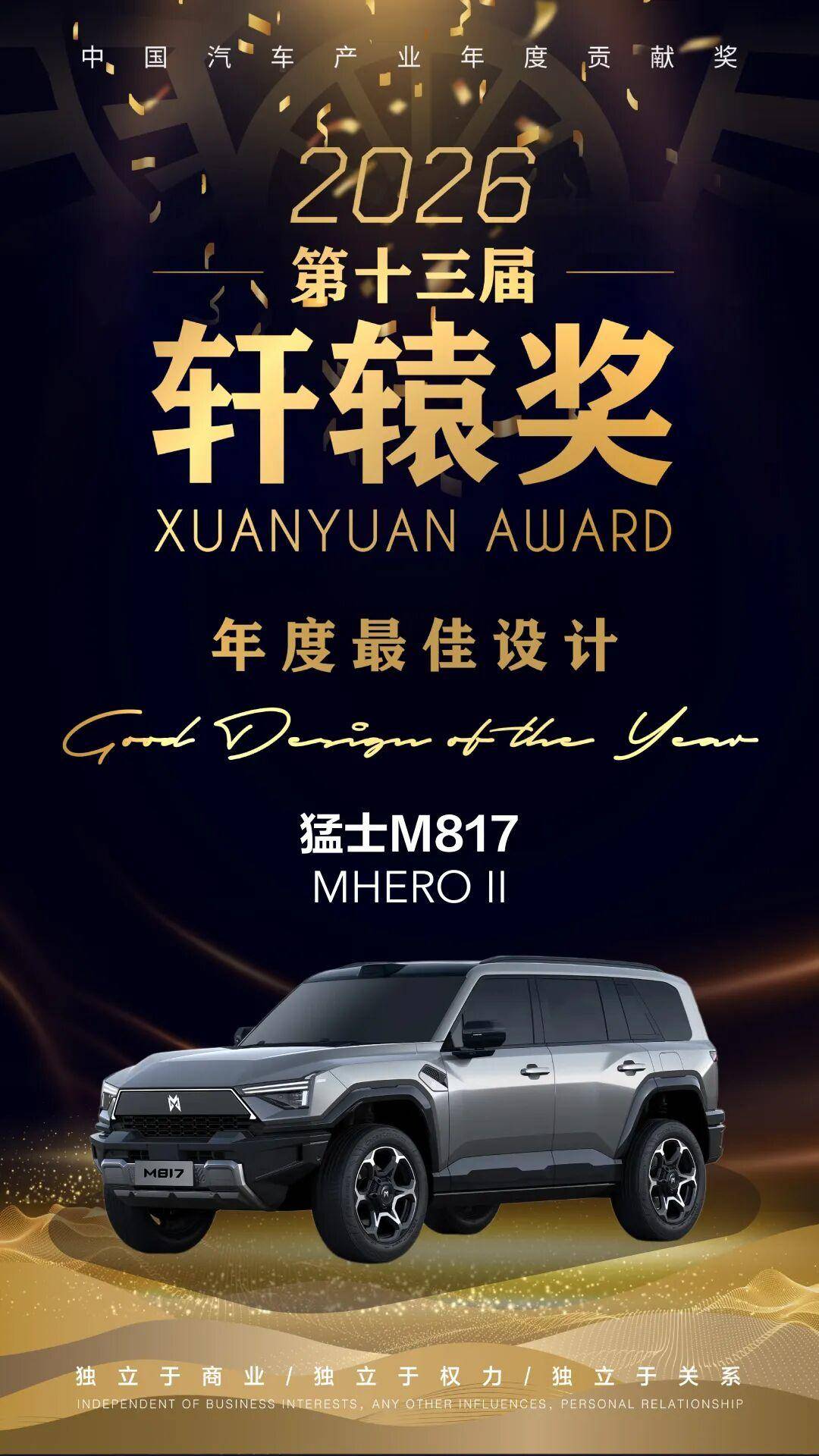 获奖理由:猛士M817不仅完美承袭了猛士品牌的硬派基因,更以无畏姿态实现了突破与超越,内饰设计层次丰富却又克制均衡,用料扎实且工艺严谨。通过将硬核越野能力与舒适公路驾乘体验相融合,再叠加华为鸿蒙智能座舱与组合辅助驾驶能力,猛士M817不仅打破了硬派车型的体验边界,更成为改变国内越野品牌市场格局的重量级产品。