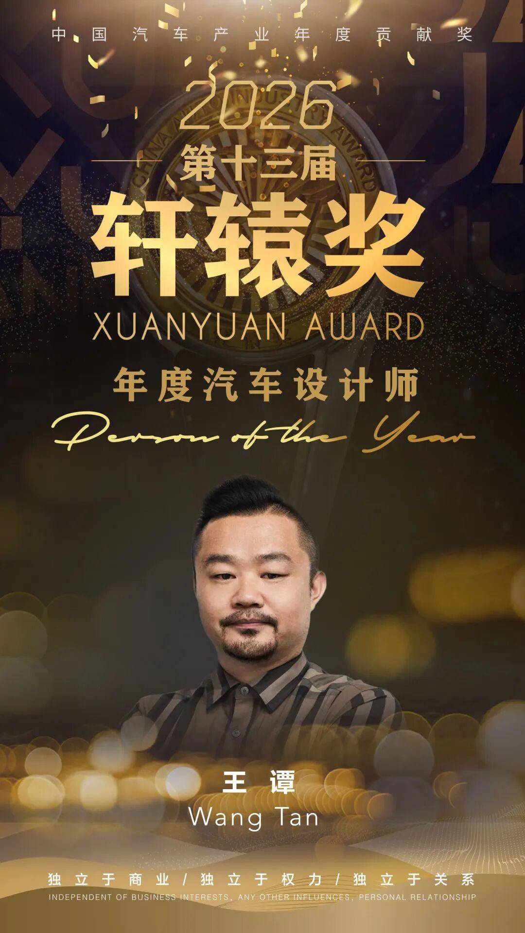 获奖理由:他是穿梭于现实与未来的造梦师;他将未来感注入画笔,每一笔设计都超乎想象;他既能勾勒飞行汽车划破天际的凌厉线条,也能雕琢地面座驾惊艳时光的炫酷轮廓;他执着于内心的梦想,拒绝循规蹈矩;原创是他的底色,未来感是他的锋芒;他用极致的创意,用独树一帜的设计语言,让科技与美学完美交融,描绘出交通出行的全新可能,引发了一场美好出行的革新风暴;他就是小鹏汽车造型中心总经理、小鹏汇天联合创始人及副总裁王谭。