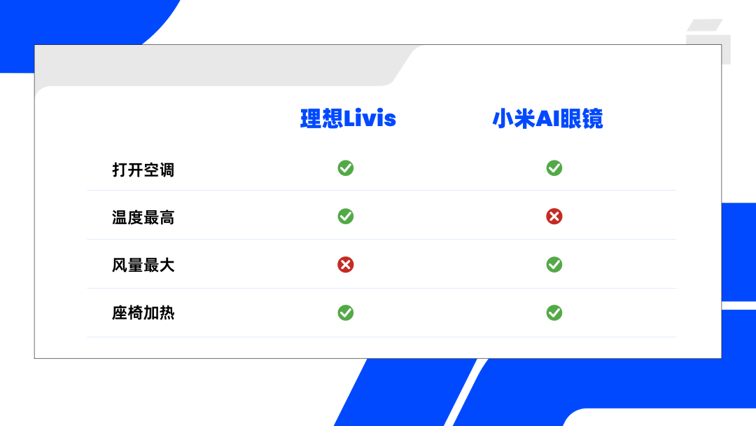 在远程开启空调的测试中,面对三条复合指令,两者各只能完成其中两项:小米AI眼镜未执行“调至最高温度”,Livis未执行“风量开到最大”。