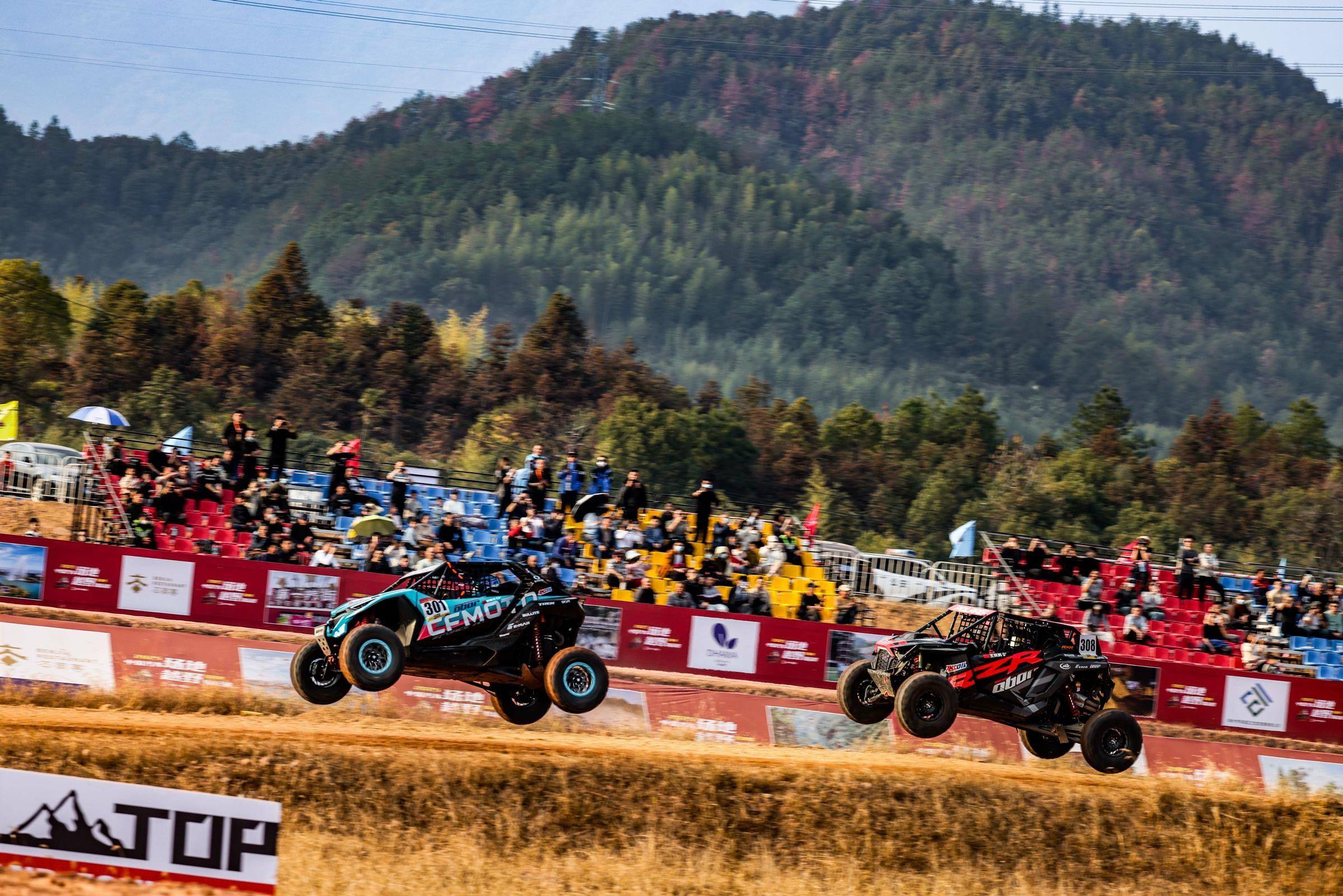 UTV改装组竞争更为胶着,CFMOTO春风动力车队、车仆车队和雷登轮胎车队呈现多点开花的格局。昨天拿下杆位的杜炫义(301号)继续神勇发挥,以总成绩11分07秒69排名第一。紧随其后的是车仆车队赵福强(302号),排在UTV改装组第三的是雷登轮胎车队王翔(305号)。