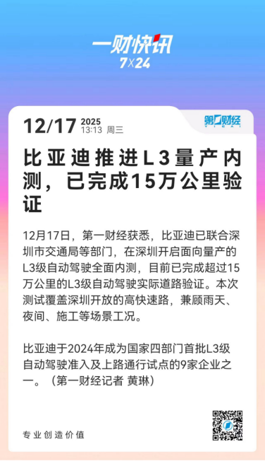 比亚迪全面推进L3级自动驾驶量产内测 已完成15万公里验证