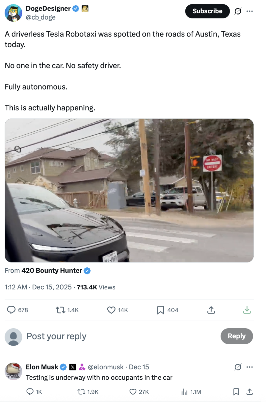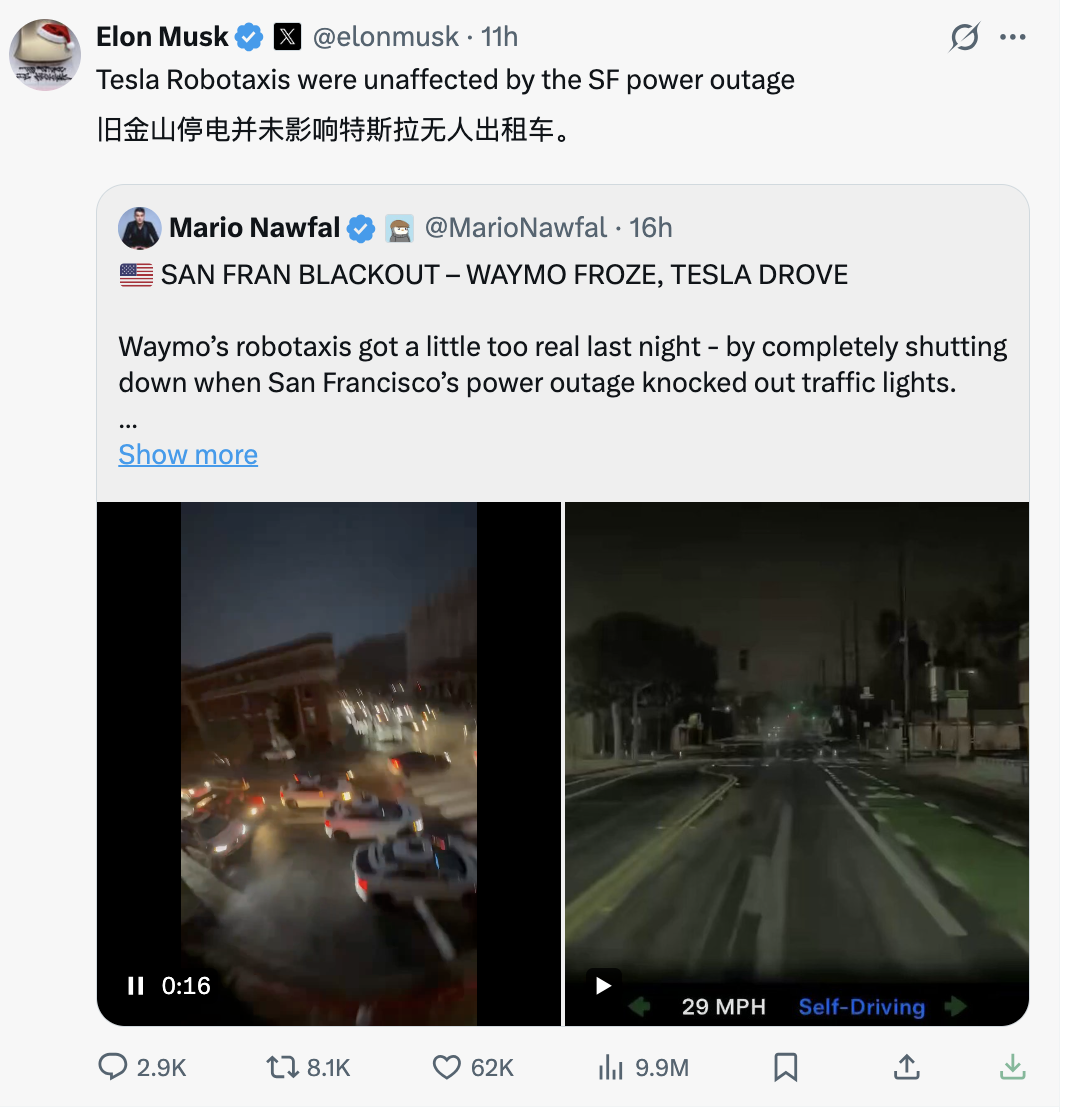 马斯克在个人X账号上转发了Waymo事件,并配文“旧金山停电并未影响特斯拉无人出租车”。
