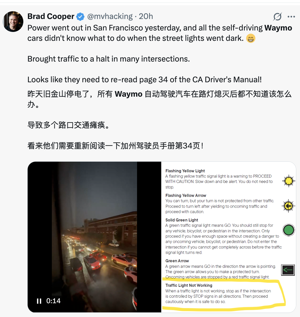 于是大量的指责对准了Waymo,还有人辛辣地讽刺Waymo,说Waymo所有的Robotaxi在红绿灯关闭后都不知所措,导致路口交通瘫痪,看来它们需要重新阅读下加州驾驶员手册第34页。