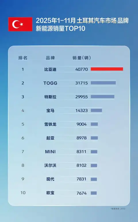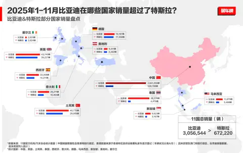 2025年1-11月,比亚迪在英国、德国、意大利、西班牙、奥地利、爱尔兰、马来西亚、土耳其、新加坡、泰国、中国等11个汽车核心国家市场,销量已经全面超越特斯拉。凭借多元化产品矩阵,比亚迪精准契合了全球不同市场消费者的差异化需求。同时,通过推进自建滚装船、本地化生产、构建完善的服务体系等一系列协同举措,为其海外拓展提供了坚实支撑。在这些出海策略的有力推动下,比亚迪出海狂飙全球领跑。