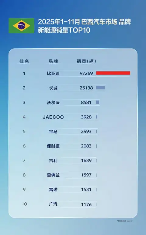 11月,比亚迪在巴西、土耳其、意大利、西班牙、匈牙利、克罗地亚等国拿下了新能源汽车销量第一,在新加坡等国家获得全品牌销冠。1-11月累计表现同样不俗,在巴西、土耳其、西班牙、意大利等国,比亚迪位列新能源汽车品牌销量榜首;在新加坡、中国香港等地区市场荣膺全品牌销量第一,备受消费者认可。