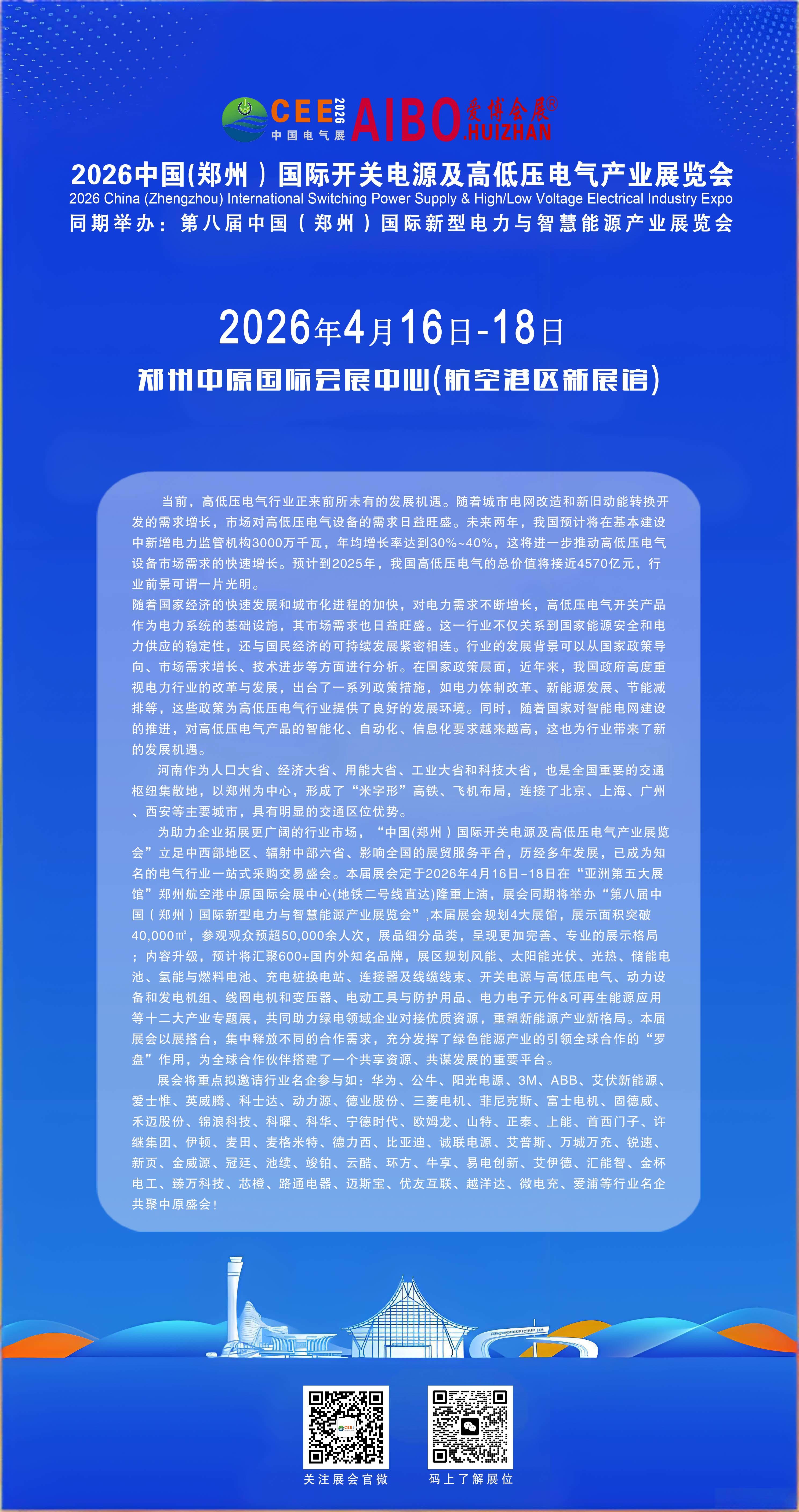 为助力企业拓展更广阔的行业市场,“中国(郑州)国际开关电源及高低压电气产业展览会”立足中西部地区、辐射中部六省、影响全国的展贸服务平台,历经多年发展,已成为知名的电气行业一站式采购交易盛会。本届展会定于2026年4月16日-18日在“亚洲第五大展馆”郑州航空港中原国际会展中心(地铁二号线直达)隆重上演,展会同期将举办“第八届中国(郑州)国际新型电力与智慧能源产业展览会”,本届展会规划4大展馆,展示面积突破40,000㎡,参观观众预超50,000余人次,展品细分品类,呈现更加完善、专业的展示格局;内容升级,预计将汇聚600+国内外知名品牌,展区规划风能、太阳能光伏、光热、储能电池、氢能与燃料电池、充电桩换电站、连接器及线缆线束、开关电源与高低压电气、动力设备和发电机组、线圈电机和变压器、电动工具与防护用品、电力电子元件&可再生能源应用等十二大产业专题展,共同助力绿电领域企业对接优质资源,重塑新能源产业新格局。本届展会以展搭台,集中释放不同的合作需求,充分发挥了绿色能源产业的引领全球合作的“罗盘”作用,为全球合作伙伴搭建了一个共享资源、共谋发展的重要平台。