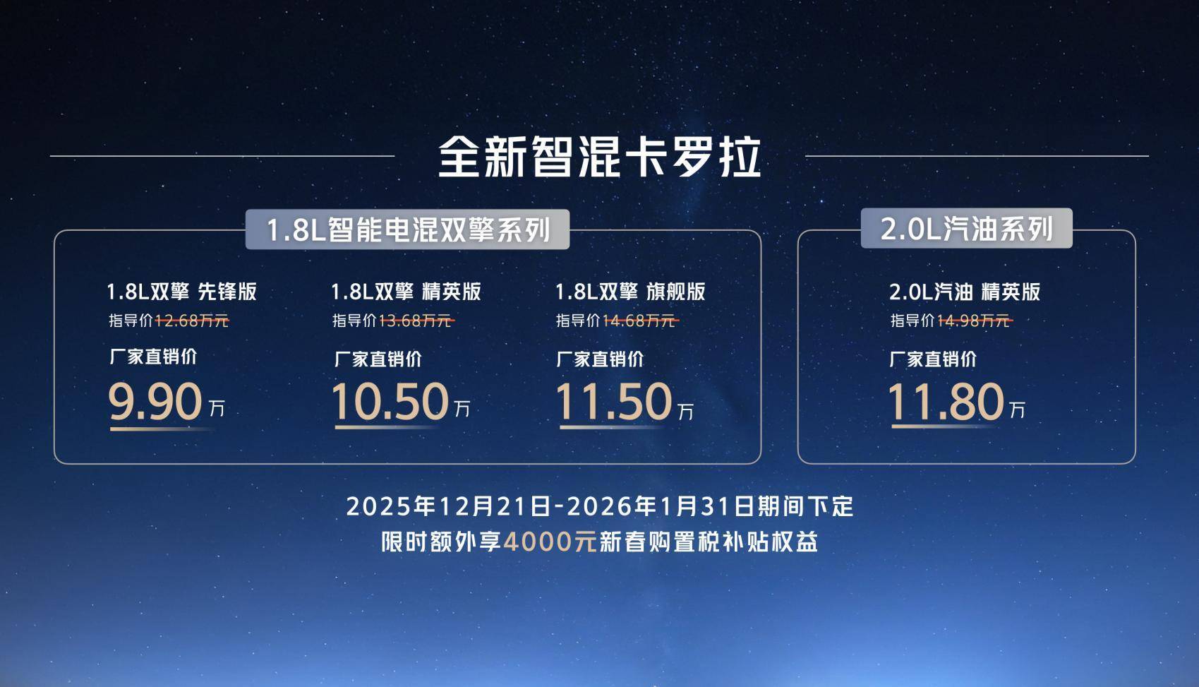 12月21日,“全球好品质 中国新家轿”全新智混卡罗拉(参数|询价)焕新上市,共推出4个版本,厂商直销价为:9.9万元-11.8万元。即日起至1月31日期间下定,限时额外享受4000元新春购置税补贴权益。