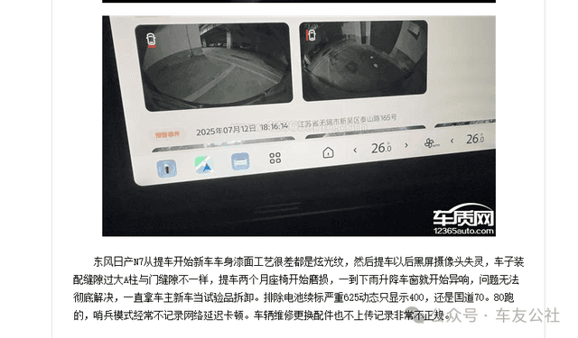 车友公社查阅公开资料得知,东风日产N7于2025年4月27日上市,推出5款车型,售价11.99-14.99万元。虽是一款上市不足8个月的新车,却已经是投诉重灾区。车质网数据显示,11月东风日产N7的投诉销量比达万分之72.2。投诉问题主要集中在“车身附件及电器”类别,其中“续航严重虚标”占比最高,不少车主反馈“标称625公里,动态续航只显示400公里左右”,与卓先生的情况高度相似。