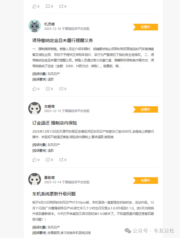 在黑猫投诉平台的汽车黑榜上,东风日产位列第三位,除了N7的续航问题,还涉及售后态度差、承诺不兑现等多种问题的投诉,大量车主在平台留言等待官方解决方案。