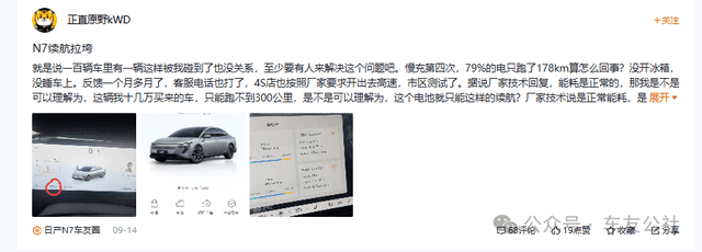 值得注意的是,懂车帝平台“东风日产N7实测”话题下,多位车主晒出真实续航数据,这些实测信息显示,日产N7的续航达成率受配置影响较大,哨兵模式、空调等功能开启后,能耗会显著上升。让不少车主不满的是,面对续航数据与宣传的差距,厂家回避的态度也成为车主集中诟病的关键点。