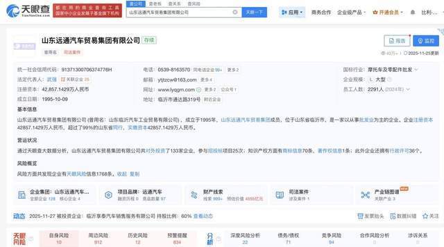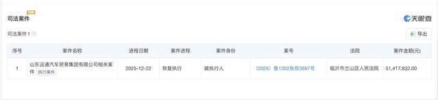 天眼查信息显示,近期山东远通汽车贸易集团有限公司恢复被执行人信息,执行标的为5141.832万元,执行法院为临沂市兰山区人民法院,案件相关细节尚未完全公示。