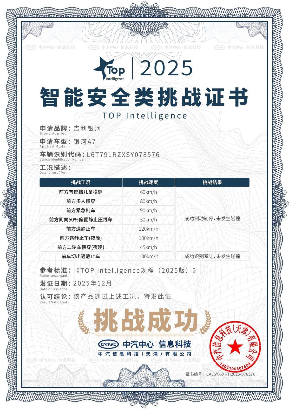12月25日,吉利银河A7(参数|询价)成功通过中汽中心行业首次中型插混轿车「双TOP」顶级安全挑战,成为行业唯一同时获颁安全性能类挑战证书和智能安全类挑战证书的的车型。安全家轿认准银河A7!凭借吉利汽车全域安全体系的最坚实底座,吉利银河成为了全球最快达成年销百万辆的新能源汽车品牌,作为银河品牌主打车型之一,吉利银河A7完整继承了吉利的安全基因,凭借7大核心安全实力,成功通过中汽中心安全大考,再次证明其作为十万级混动家轿安全新标杆的颠覆性实力。