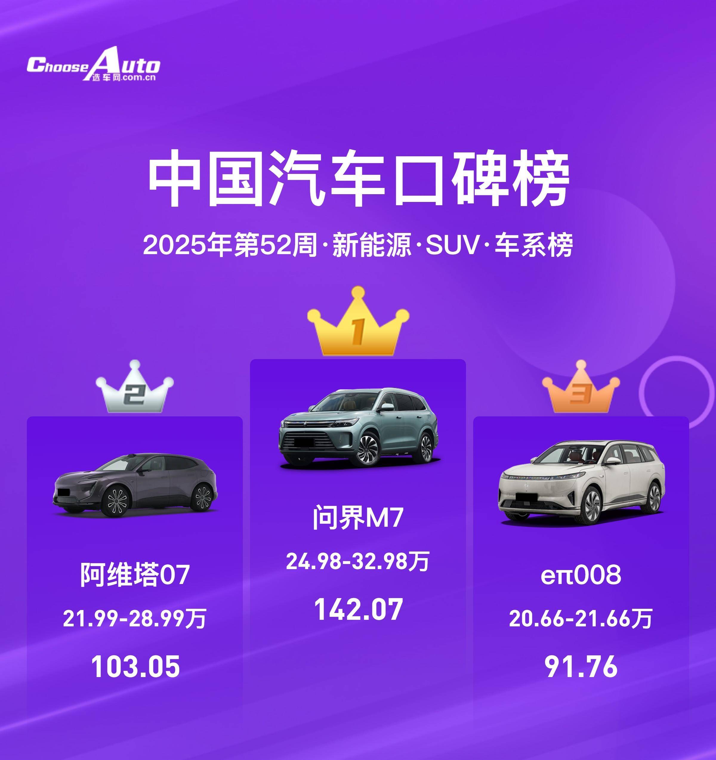 在新能源SUV领域,问界M7以142.07的高分位居榜首,显示出其在消费者中的极高人气。问界M7的价格区间为24.98-32.98万元,这一价格区间对于大多数消费者来说相对亲民,同时其性能和配置也得到了广泛认可。紧随其后的是阿维塔07和et008,分别以103.05和91.76的分数位列第二和第三。阿维塔07的价格区间为21.99-28.99万元,而et008则为20.66-21.66万元,这两款车型的性价比同样得到了市场的认可。