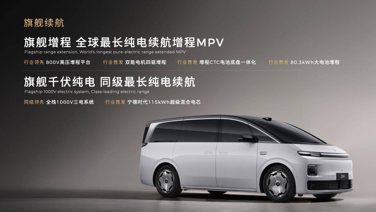 动力层面,D99提供增程与纯电双选择:增程版搭载行业首创80.3kWh大电池与800V高压平台,配合增程CTC电池底盘一体化技术,成就全球最长纯电续航增程MPV;纯电版配备115kWh宁德时代超混电芯与全栈1000V三电系统,性能与效率全面领先。舒适配置上,行业首创车规级氧舱、半苯胺头层真皮座椅与真零重力座椅,将每一排的舒适标准抬至新高度;双高通8797芯片与舱驾一体中央域控,赋能VLA大模型辅助驾驶与端侧大模型智能座舱,实现“会思考、能学习”的智慧出行。