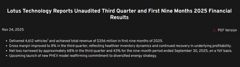 从盈利表现看,路特斯的改善趋势尤为显著:三季度毛利率从去年同期的低位大幅回升至8%,净亏损则收窄至6500万美元,同比降幅高达68%,这一收缩幅度远超前9个月41%的整体水平,直观印证其运营效率的优化正呈现季节性加速态势。